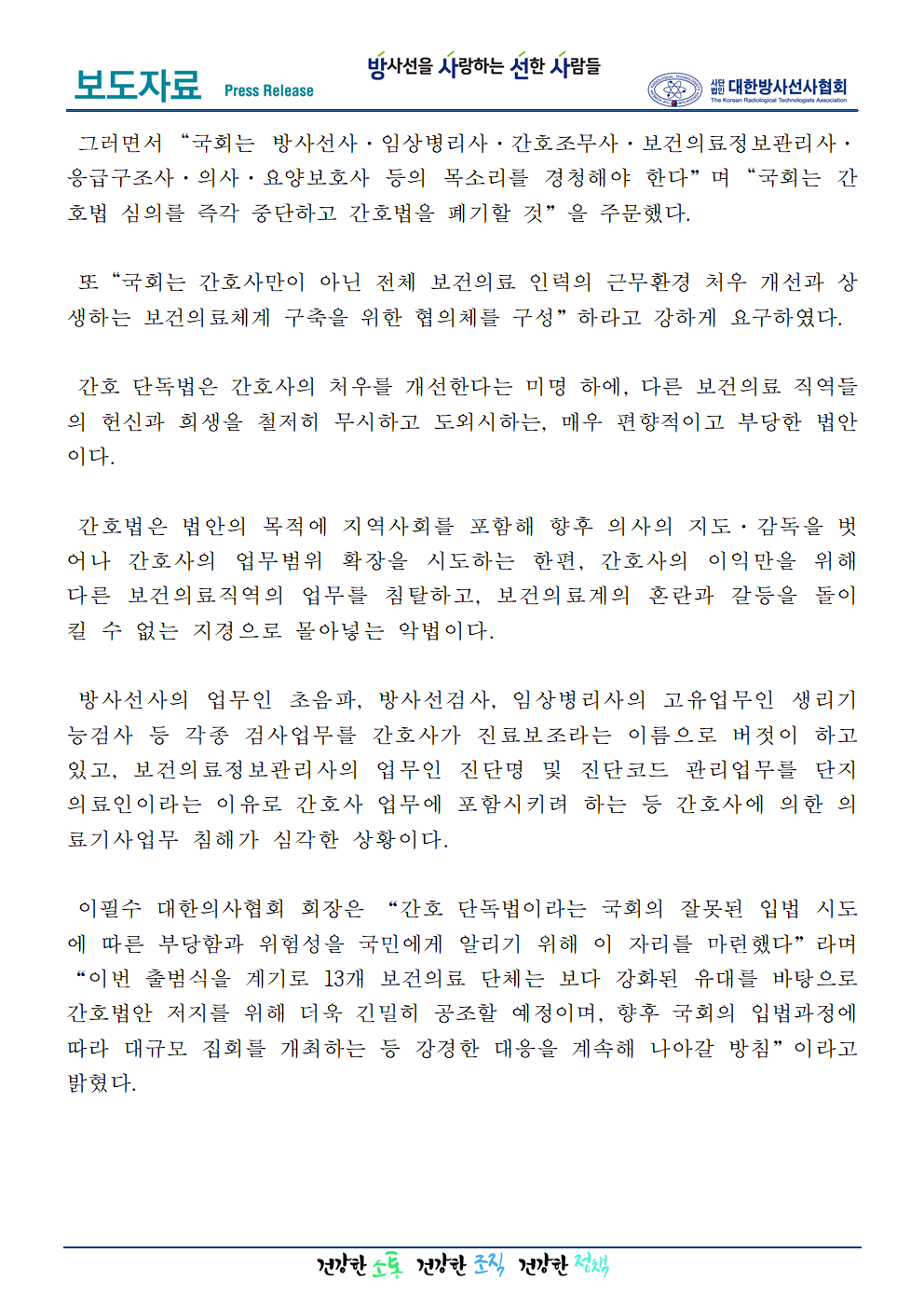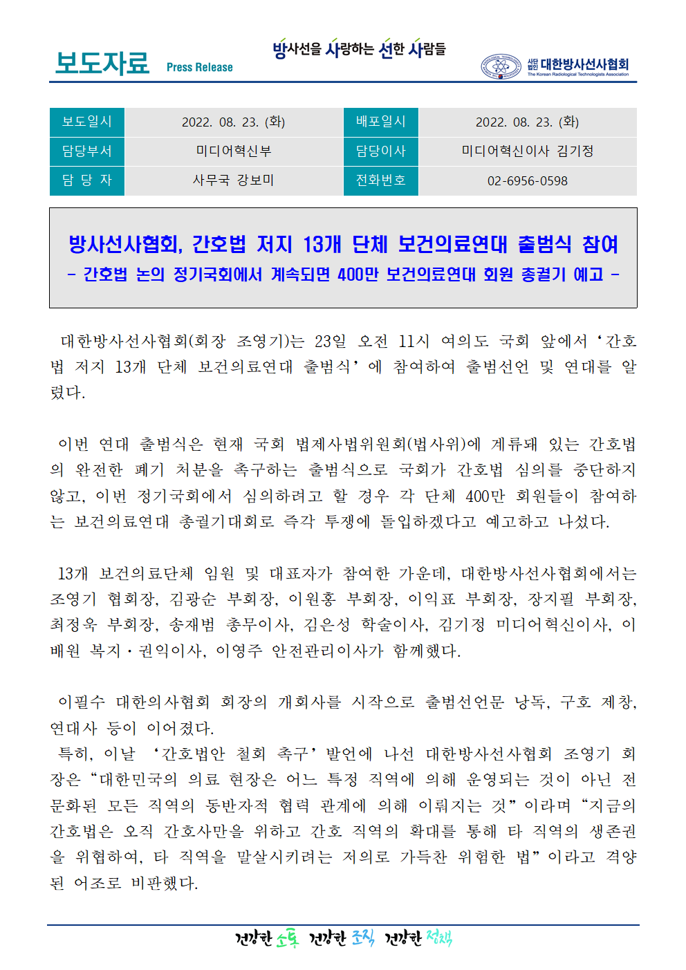 [미디어혁신부 47] 방사선사협회, 간호법 저지 13개 단체 보건의료연대 출범식 참여 페이지 정보 작성자관리자6 댓글0 조회4,865 작성일22.08.24 10:42 첨부파일 보도자료(220823)_방사선사협회, 간호법 저지 13개 단체 보건의료연대 출범식 참여 (3).pdf (381.9K) 26회 다운로드 본문 Comment 0 댓글목록 등록된 댓글이 없습니다.