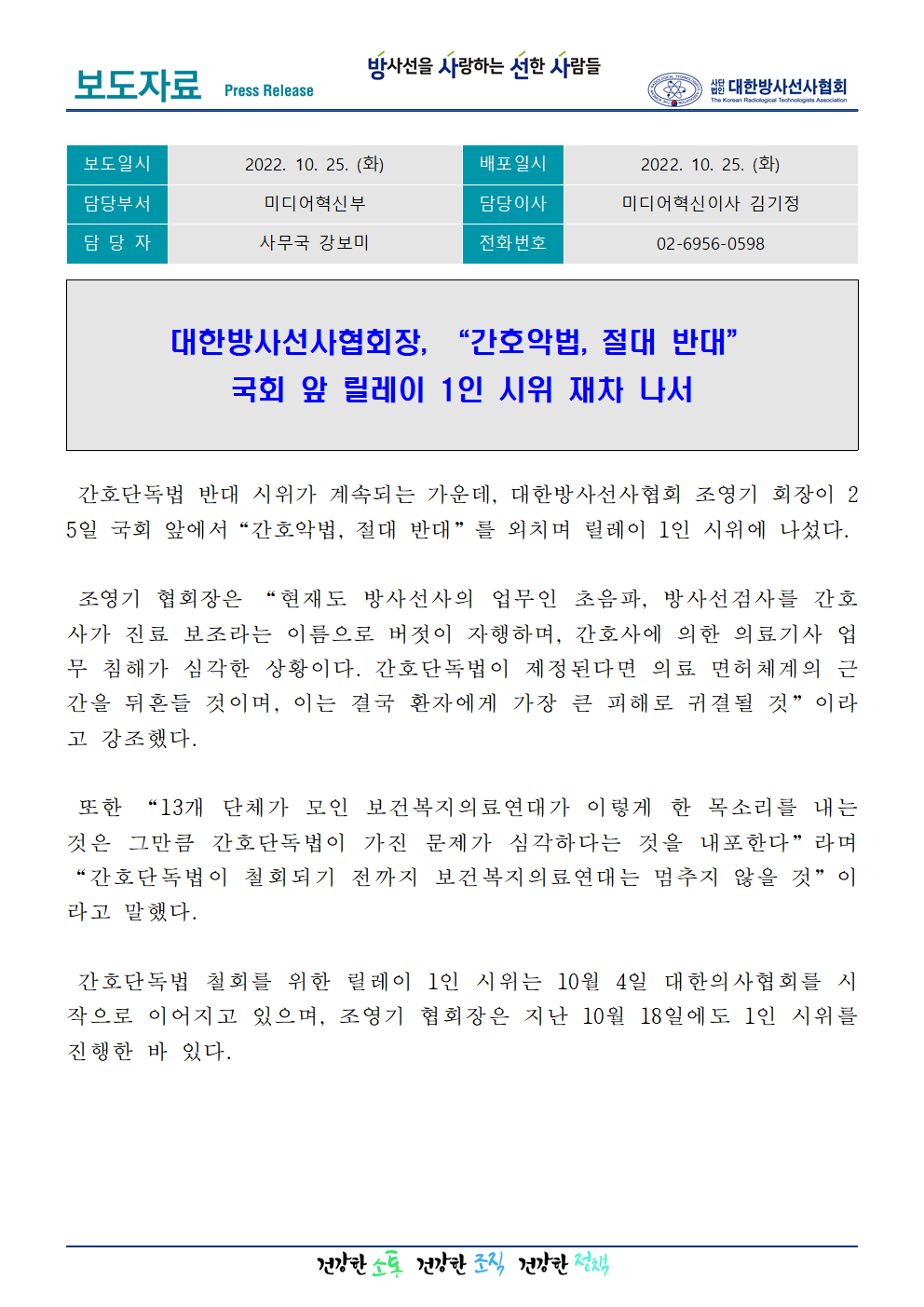 [미디어혁신부 51] 대한방사선사협회장, 국회 앞 릴레이 1인 시위 재차 나서