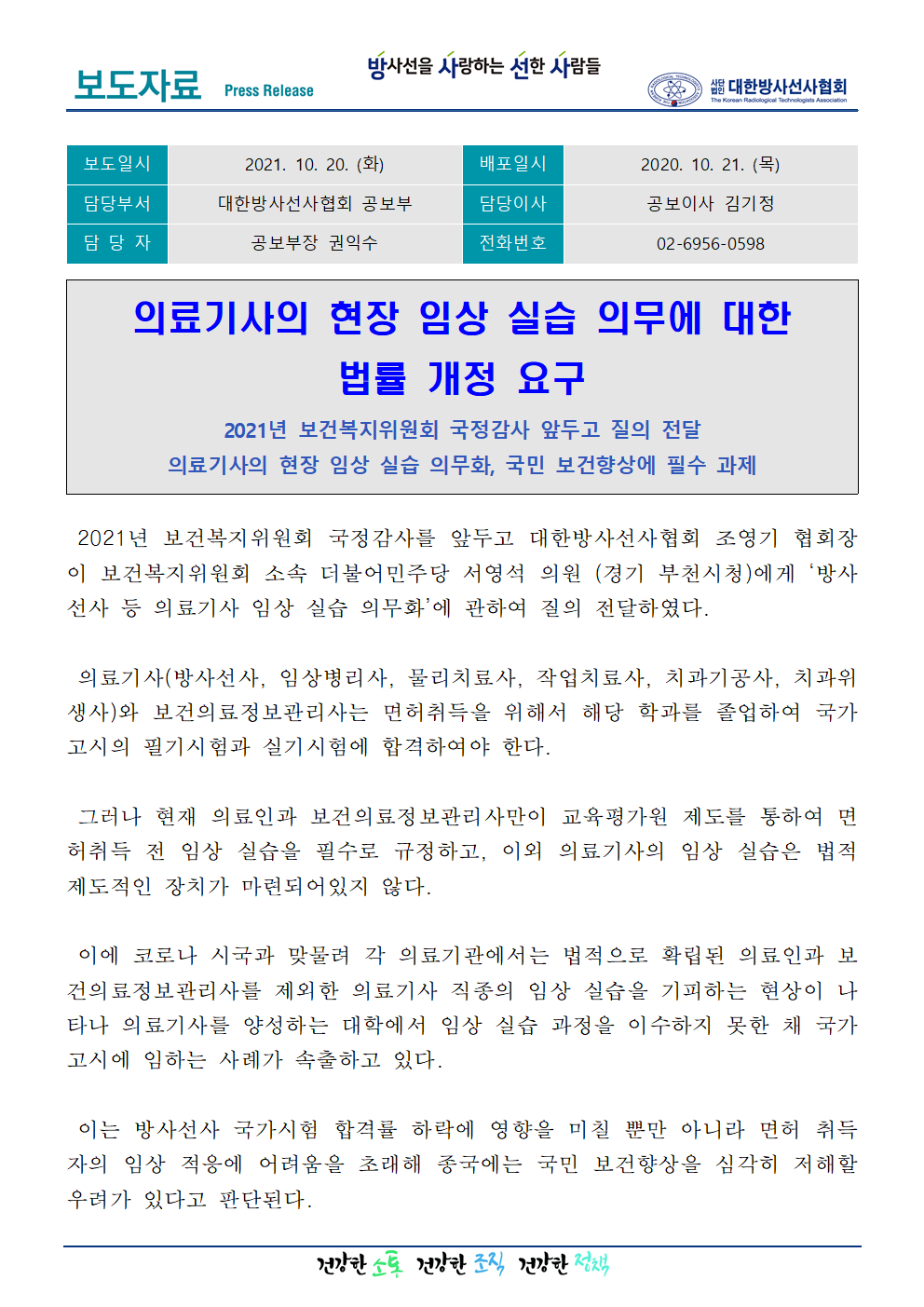 [공보부32] 의료기사의 현장 임상실습 의무에 대한 법률 개정 요구