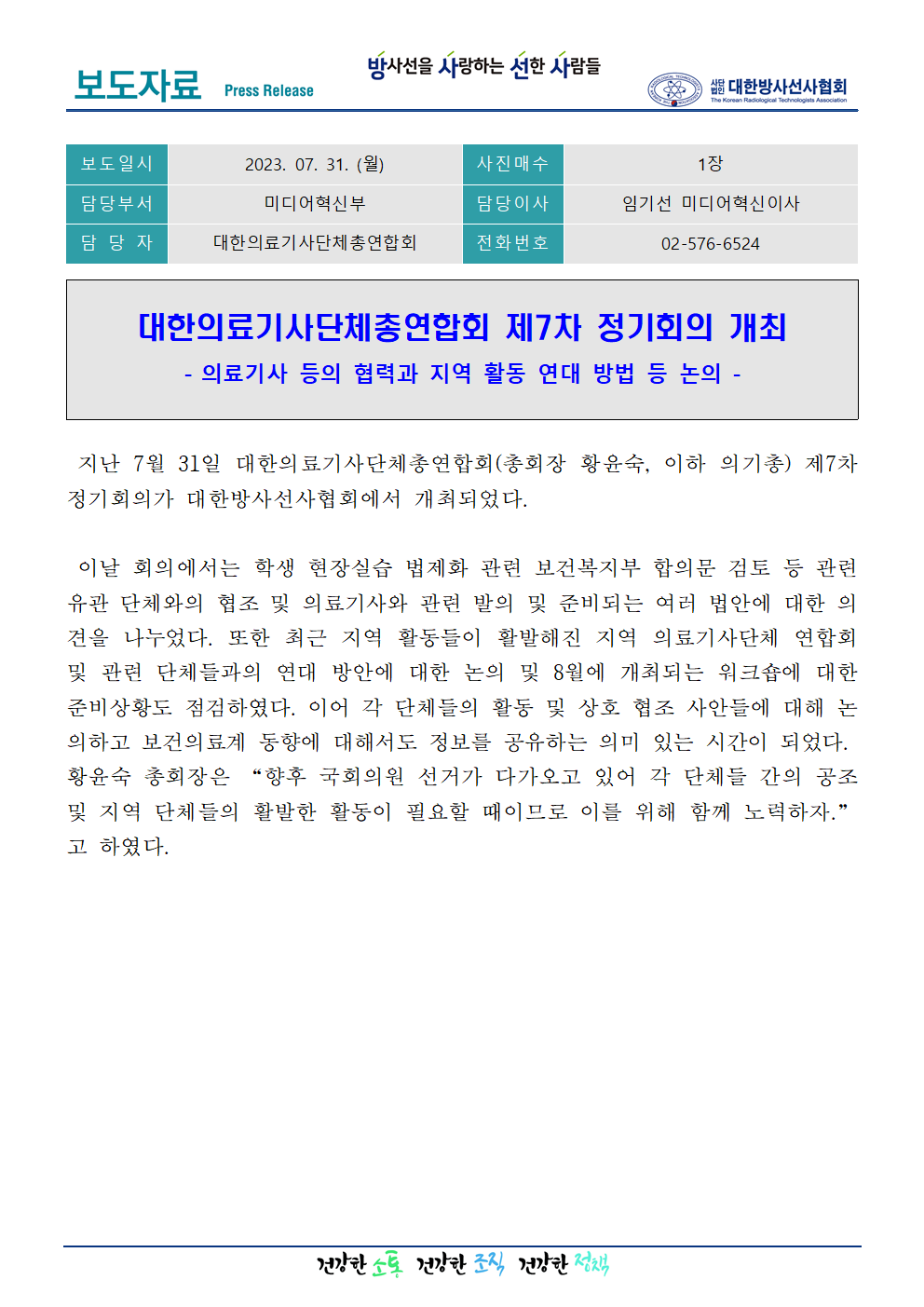 [대한의료기사단체총연합회] 대한의료기사단체총연합회 제7차 정기회의 개최