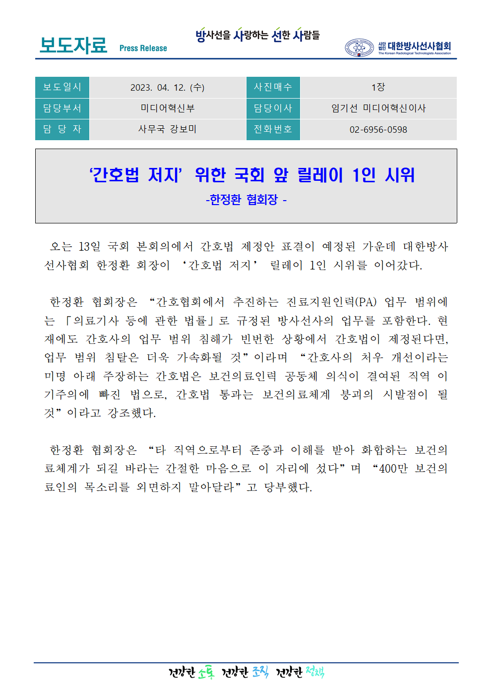 [미디어혁신부] ‘간호법 저지’ 위한 국회 앞 릴레이 1인 시위_한정환 협회장 페이지 정보 작성자관리자6 댓글0 조회1,957 작성일23.04.12 12:50 본문 Comment 0 댓글목록 등록된 댓글이 없습니다.